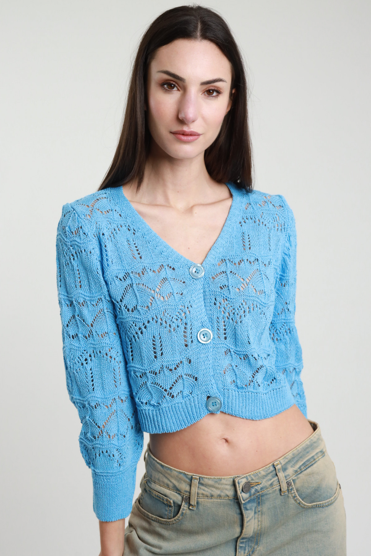 Crop Cardigan in Perforated Cotton Knit, 3 Button Closure. 50%co 50%ac