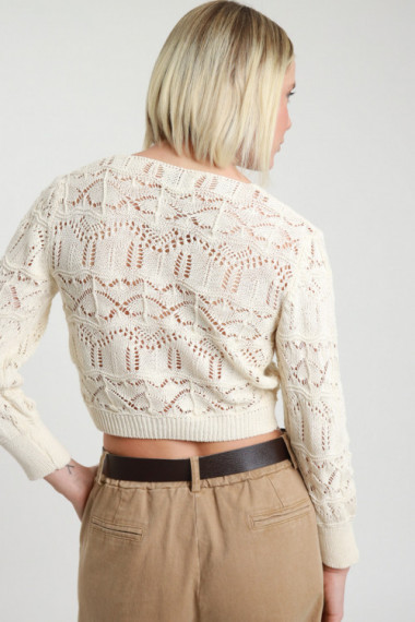 Crop Cardigan in Perforated Cotton Knit, 3 Button Closure. 50%co 50%ac