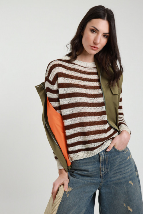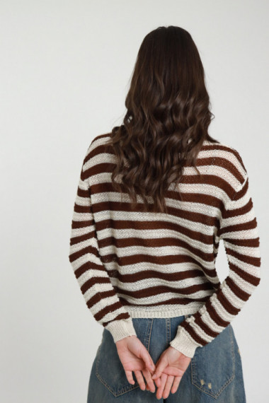Perforated Crew Neck Sweater in Striped Pattern. 50%co 50%ac