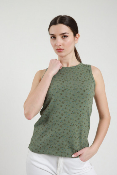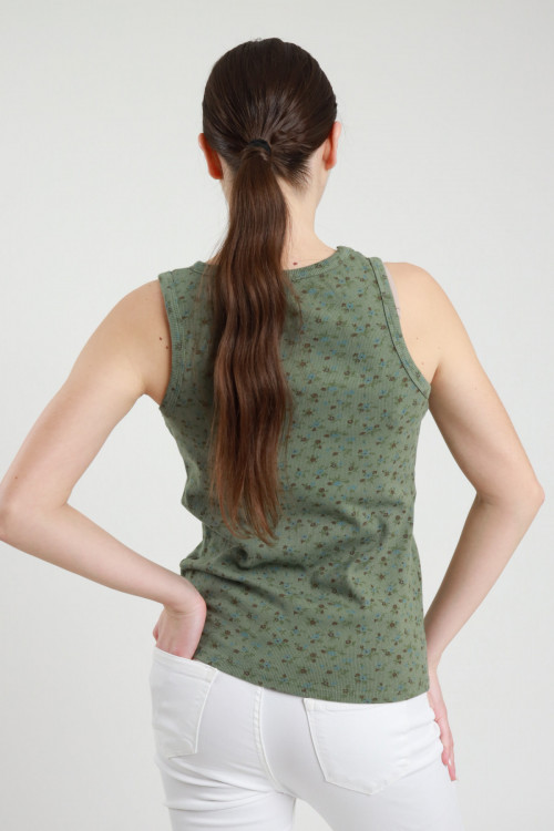 Ribbed tank top in stretch cotton, neckline in a little flower pattern. 95%co 5%ea