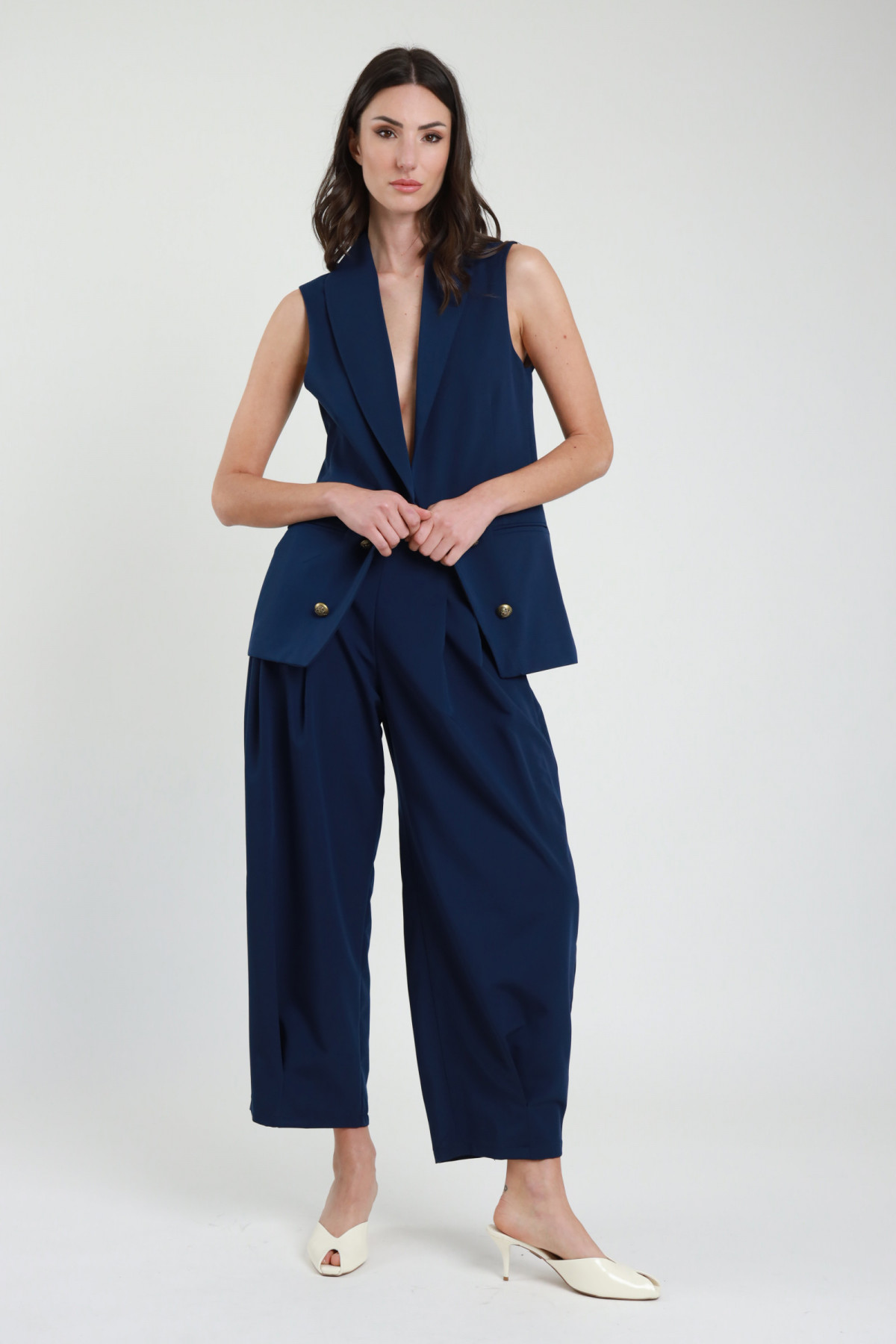 Pantaloni a Palazzo con Doppia Pences sul Fronte, Tasche Laterali ed Elastico sul Retro.
