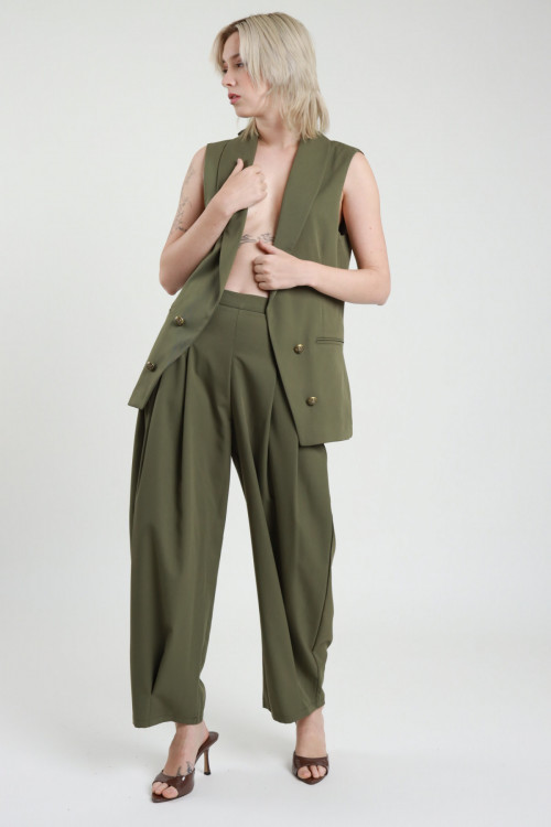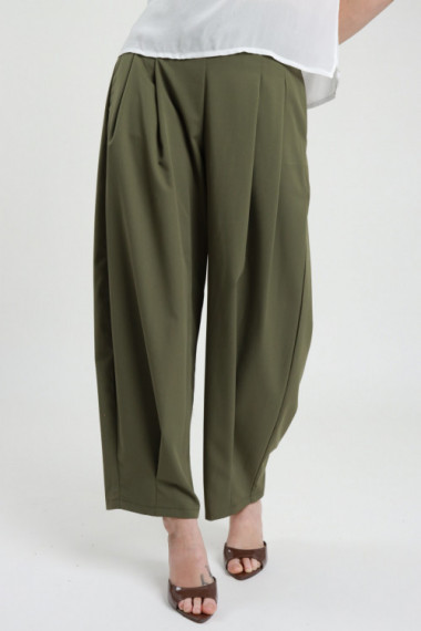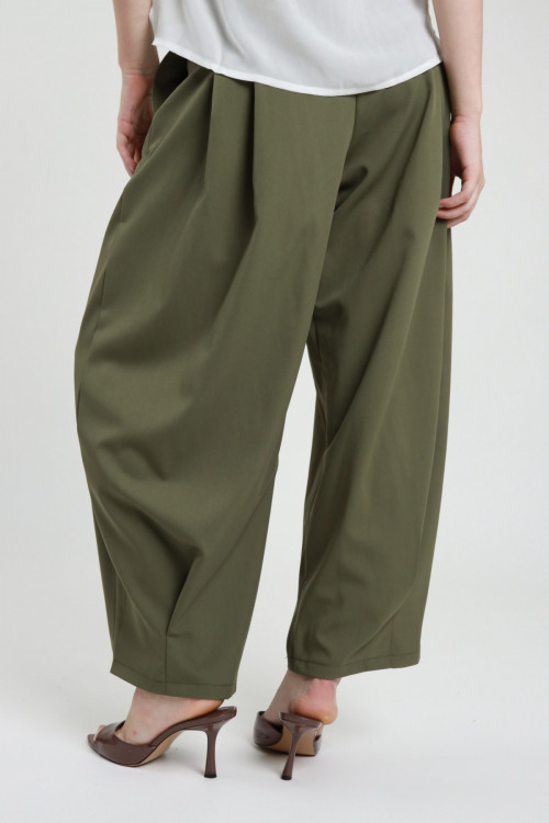 Pantaloni a Palazzo con Doppia Pences sul Fronte, Tasche Laterali ed Elastico sul Retro.