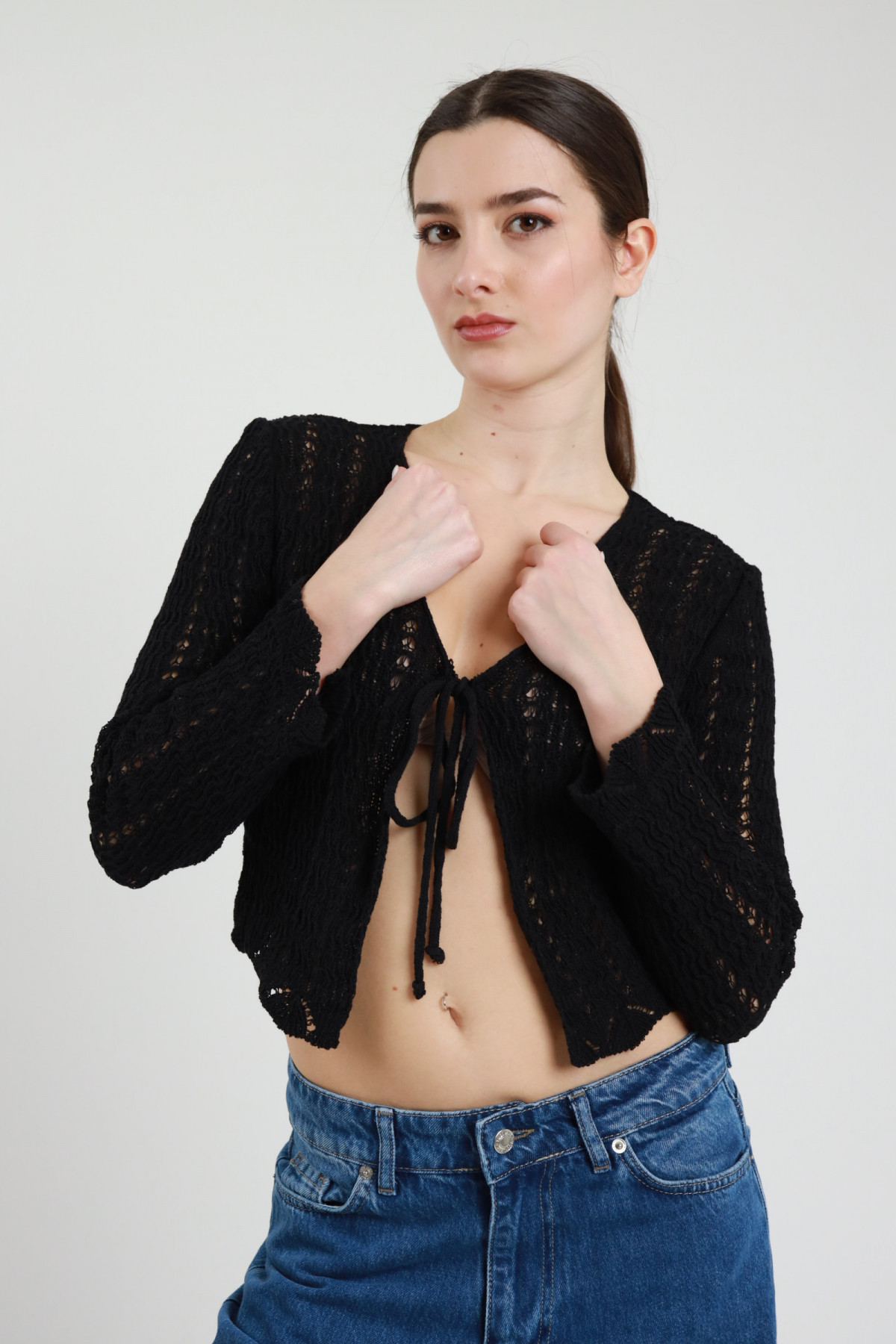 Perforated Crop Cardigan with Lace Closure. 50%co 50%ac