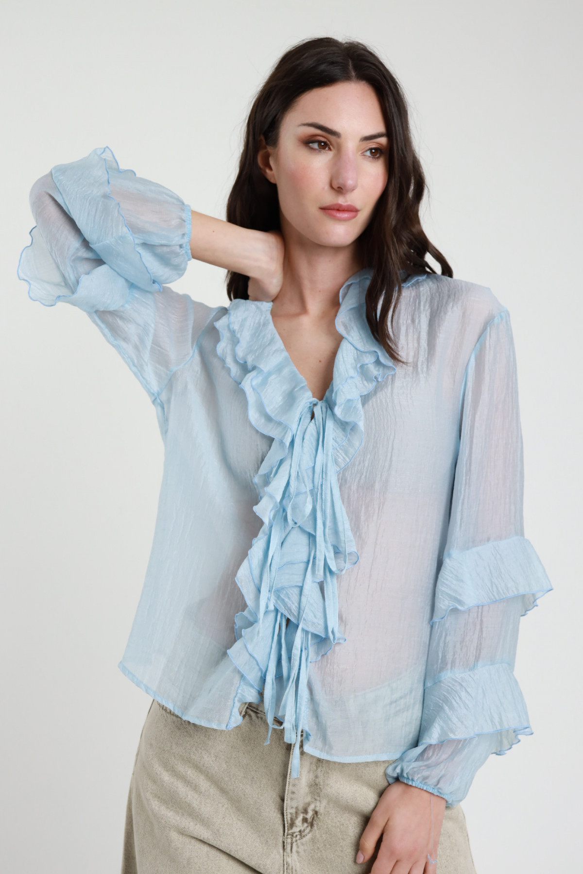 Camicia Semitrasparente con Rouches e Fiocchetti sul Fronte e sulle Maniche.