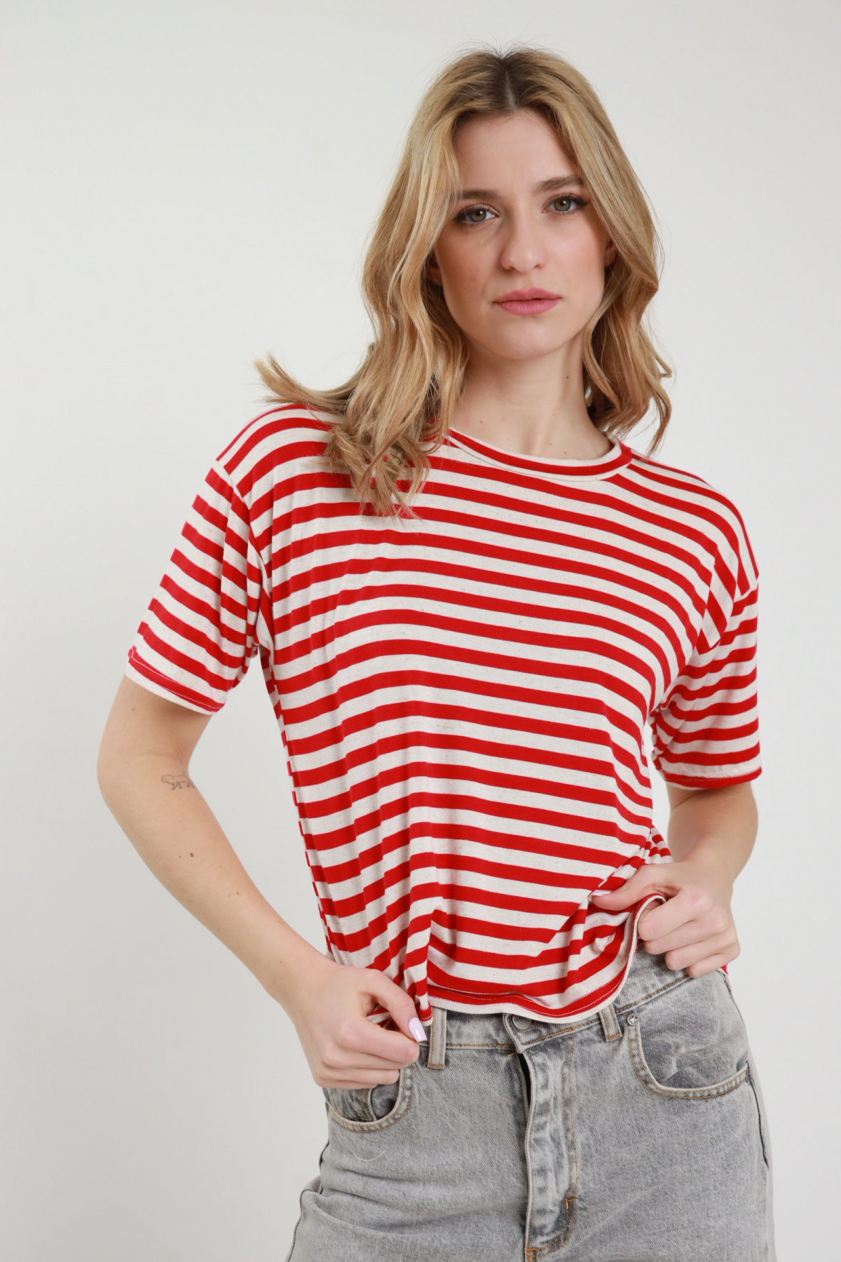 Gestreiftes Boots-T-Shirt mit kontrastierenden Ärmelkanten und Saum. 100 % vi