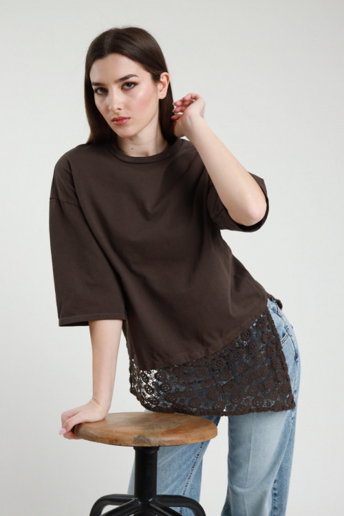 Stretch Viscose Sweater with 3/4 Sleeves and Cut-Out on the Shoulder with Golden Accessory. 94%vi 6%ea