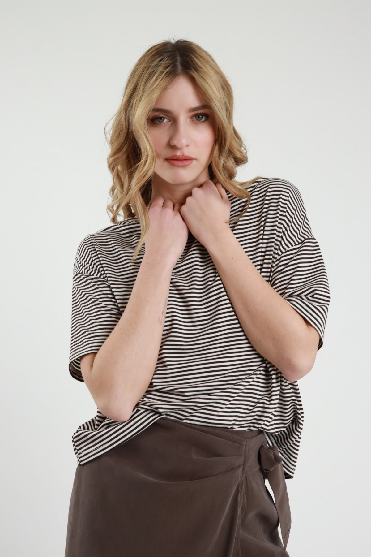 Crew-neck half-sleeved T-Shirt in stretch viscose, kimono model, in striped pattern. 94%vi 6%ea