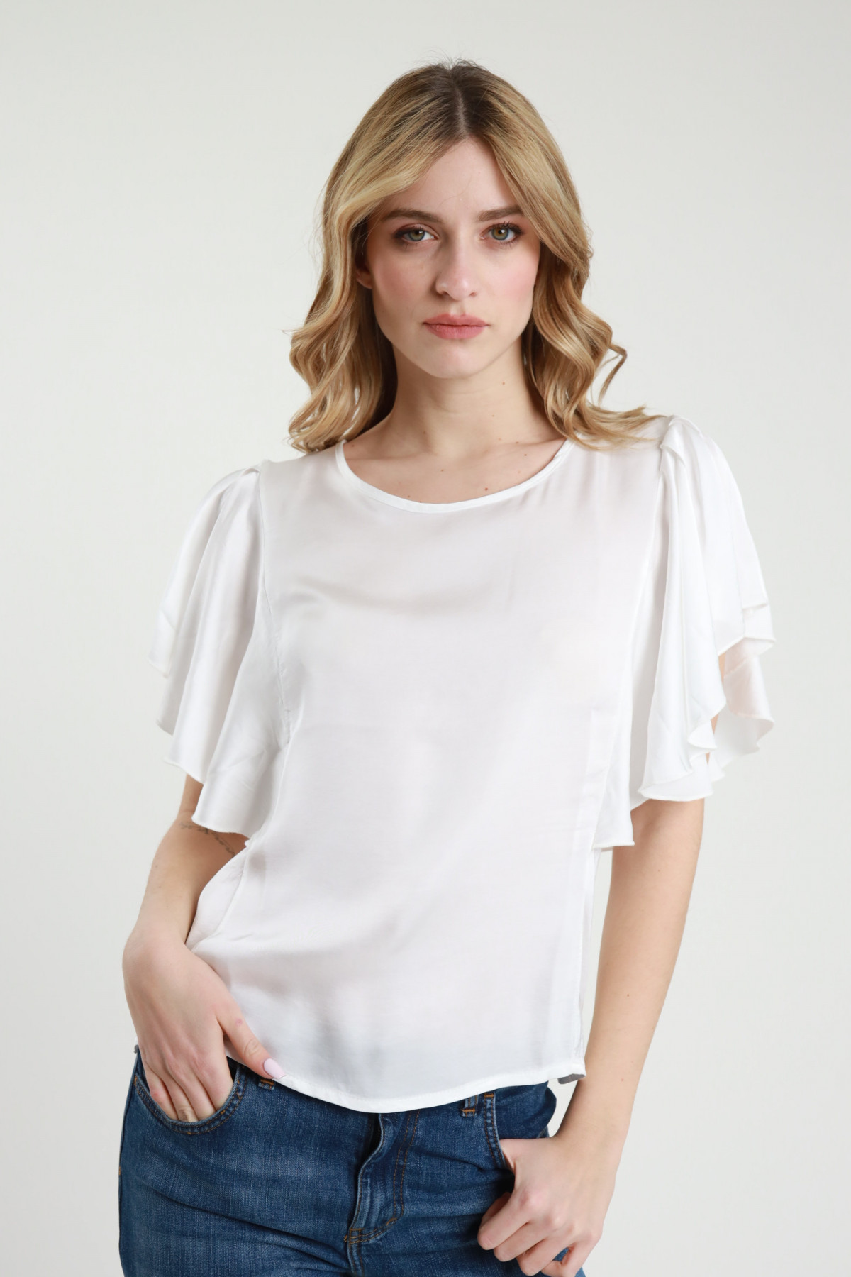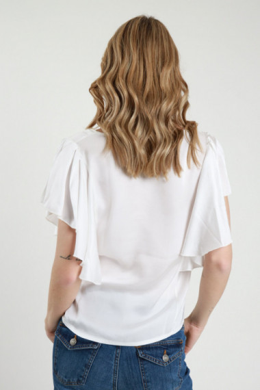 Embroidered half-sleeved blouse with ruffles and lace on the neckline, elastic under the bust and puffed sleeves. 49%ly 30%pl 21%pa