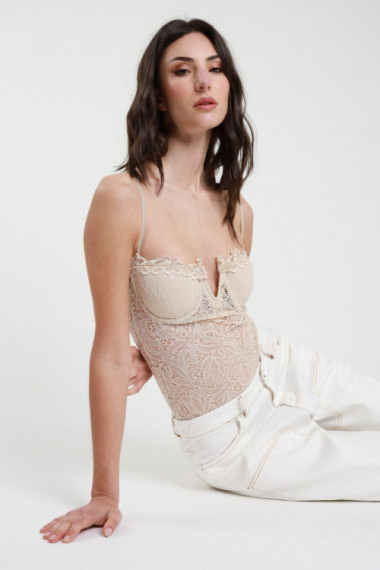 Nadelstreifen-Oberteil mit Spitze am Ausschnitt und am Saum. 86%vi 14%ny