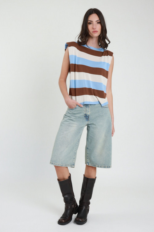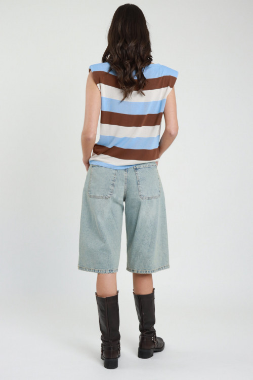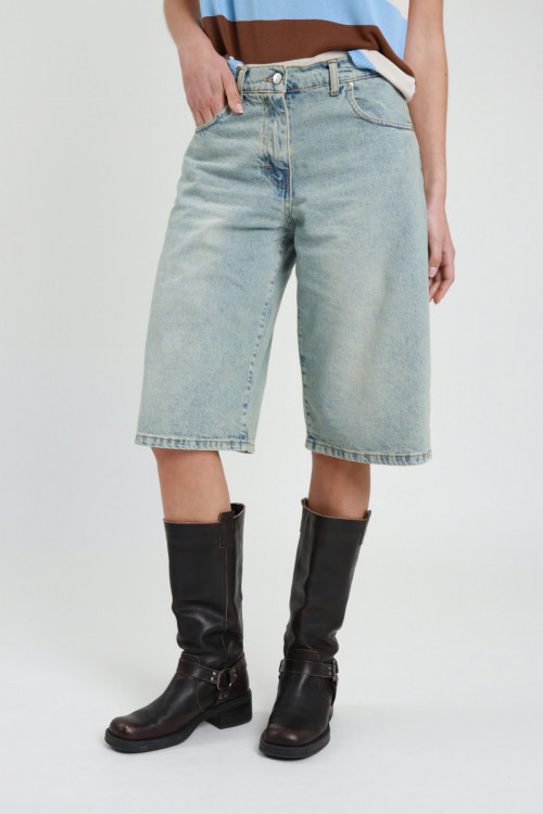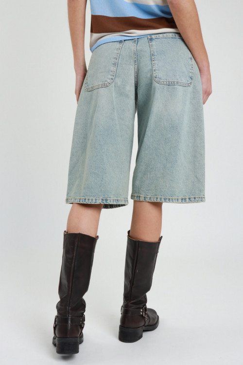 Bermuda Over in Denim, Sandblasted wash and tears, Zip and button closure. 100%co