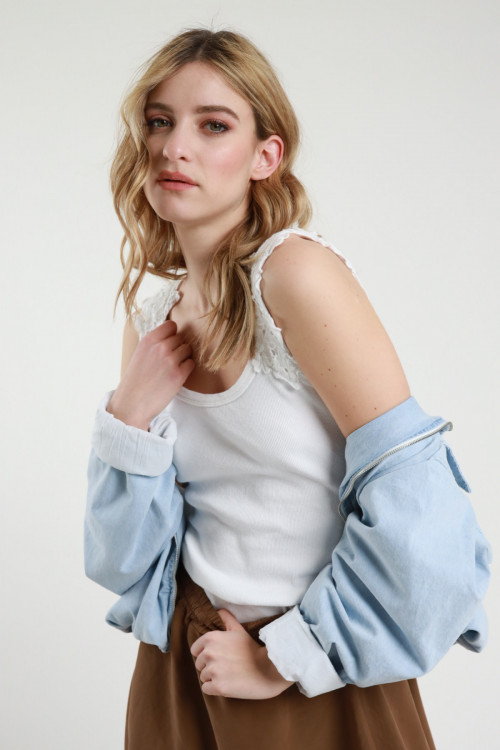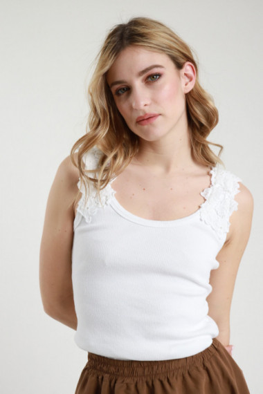 Ribbed tank top in stretch cotton, neckline in a little flower pattern. 95%co 5%ea