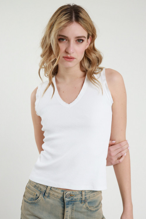 Ärmelloses Top aus Stretch-Baumwolle mit V-Ausschnitt und gestickten Rüschen. 94 % Co 6 % Stück