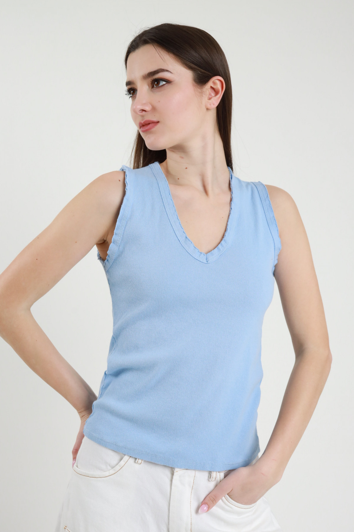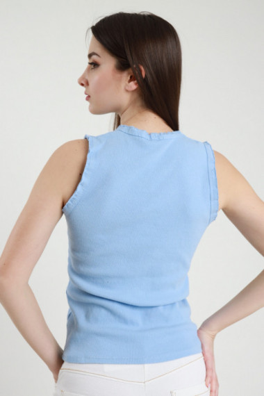 Ärmelloses Top aus Stretch-Baumwolle mit V-Ausschnitt und gestickten Rüschen. 94 % Co 6 % Stück