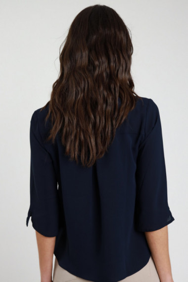 Camicia Semitrasparente in Fantasia Pois con Gale sulle Maniche a 3/4, Colletto Coreano e Nodo Rimovibile.