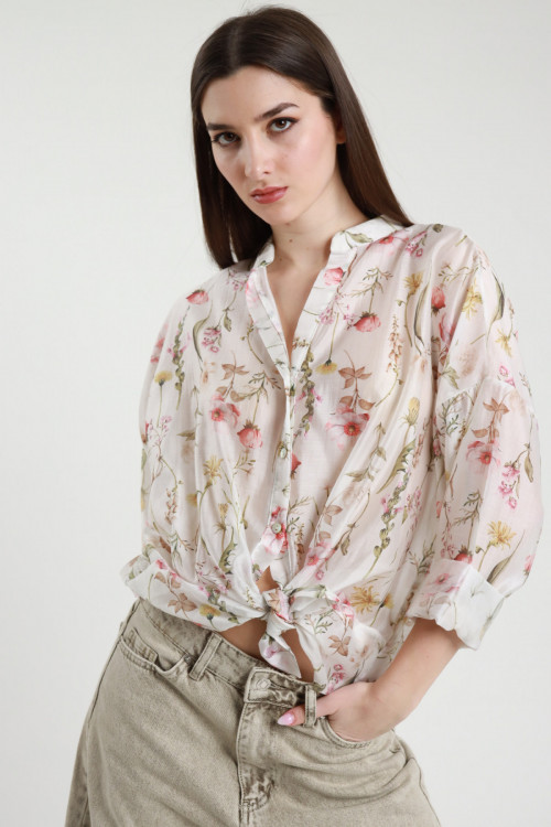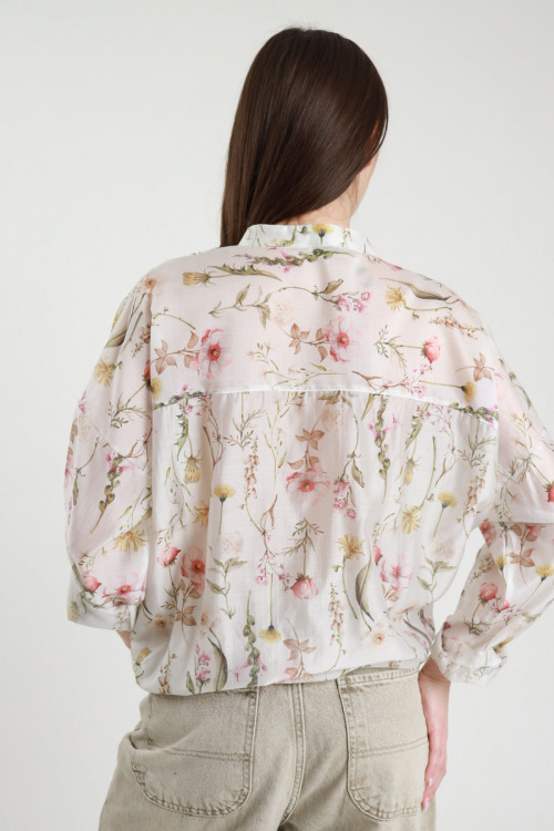 Camicia Collo alla Coreana, Semitrasparente in Stampa Fiori con Maniche a Palloncino e Volant sul Davanti.