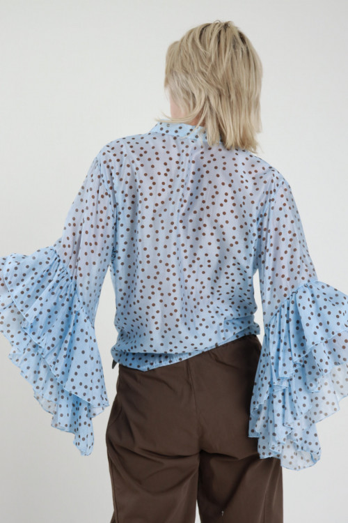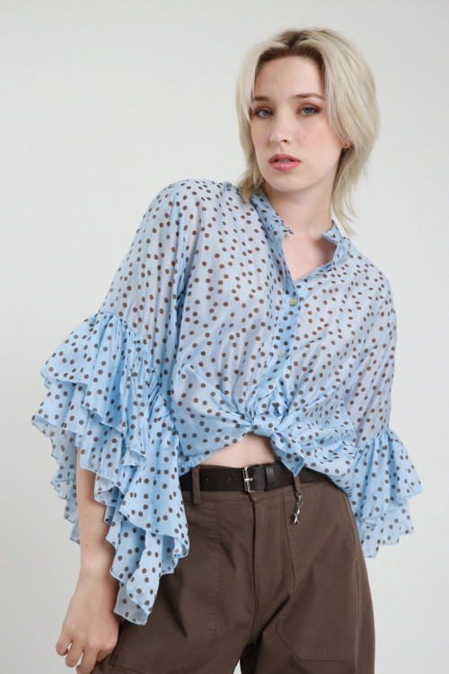 Semi-transparent Shirt in Polka Dot Pattern with Frills on 3/4 Sleeves, Korean Collar and Removable Knot. 87%ly 13%pa