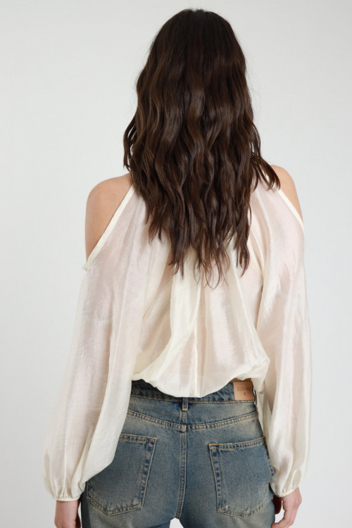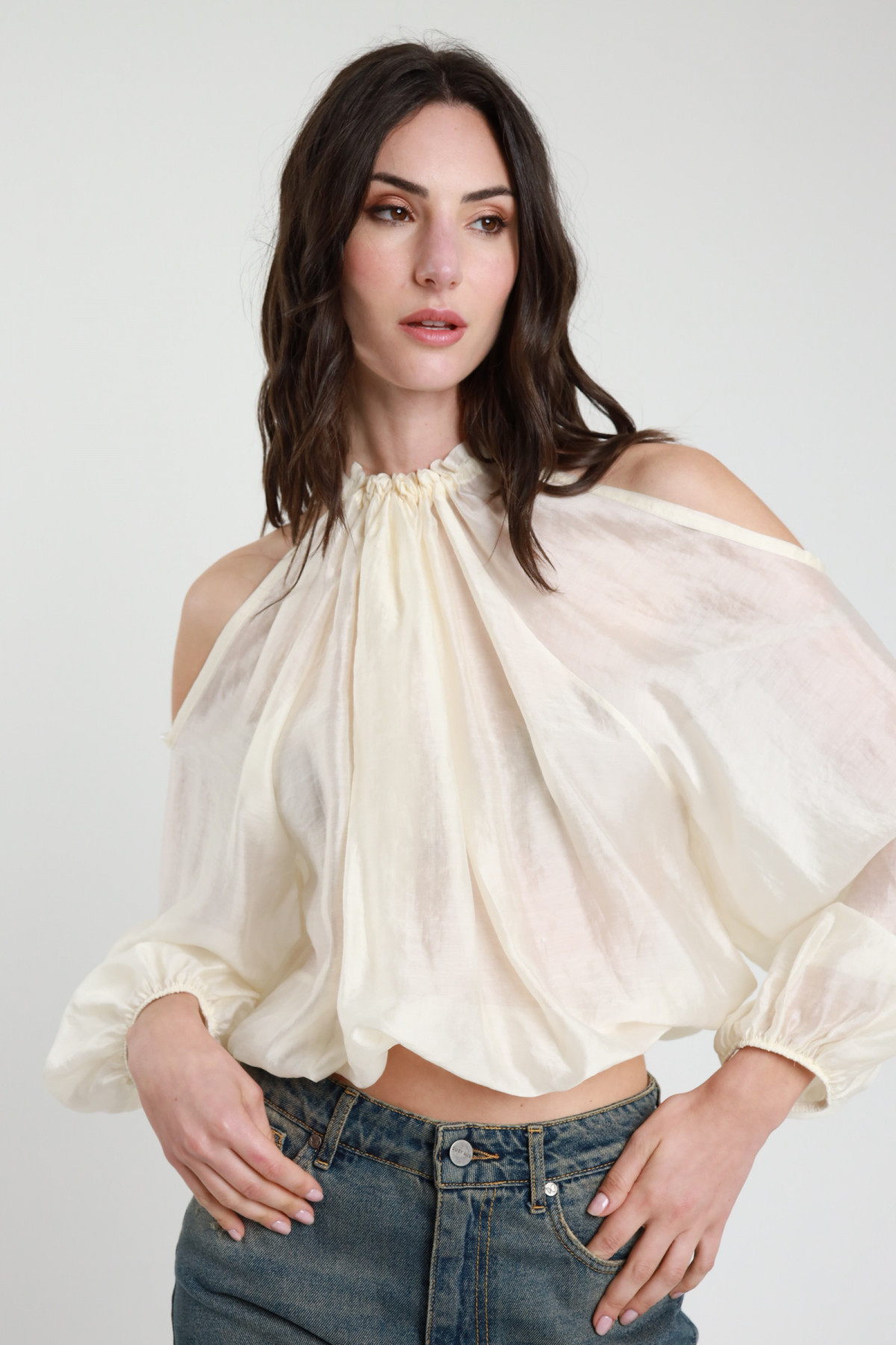 Semi-sheer Crop Blouse with Lace on the Bottom, Balloon Sleeves with Elastic on the Wrists, V-Neck. 85%ly 15%pl