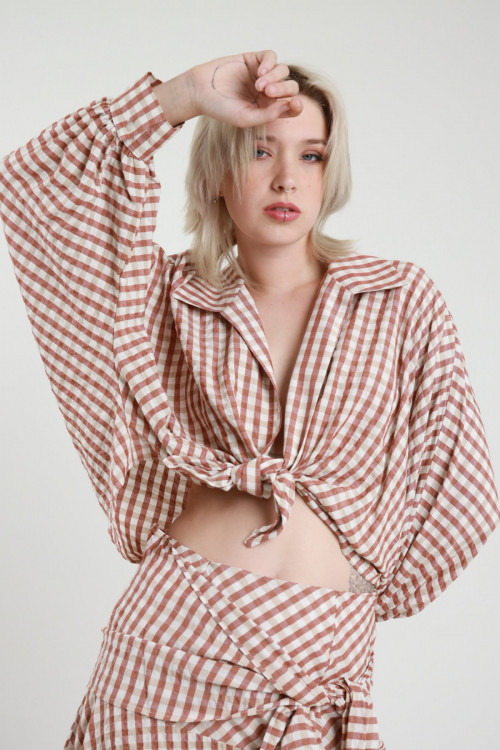 Camicia Smanicata in Fantasia Check con Bottoncini sul Fronte e Nodo sul Fondo.