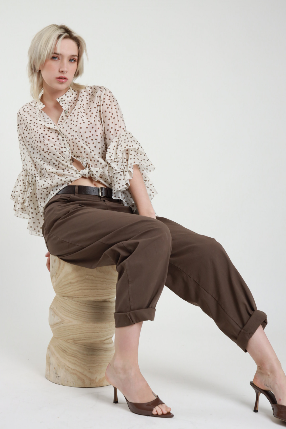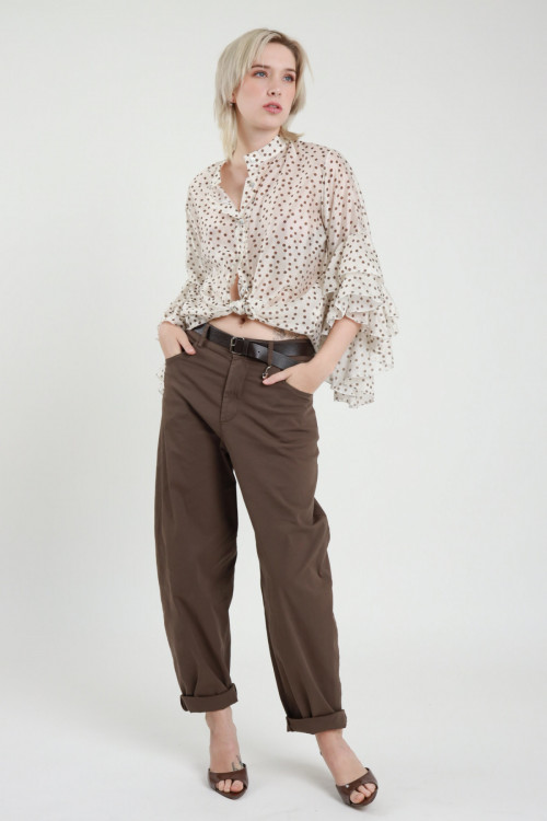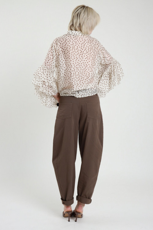 Semi-transparent Shirt in Polka Dot Pattern with Frills on 3/4 Sleeves, Korean Collar and Removable Knot. 87%ly 13%pa