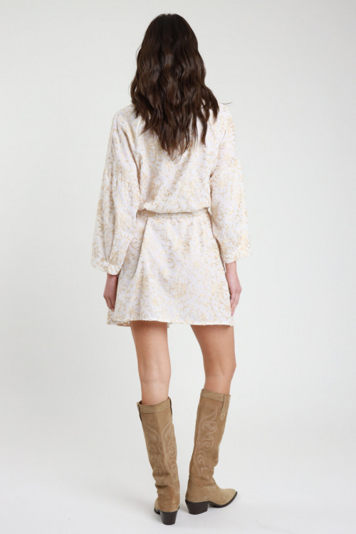 Langärmliges Kleid mit perforiertem Mittelring und Locken. Midi-Schnitt. 95 % pl 5 % Stück