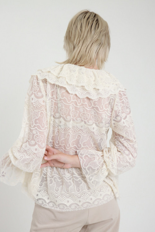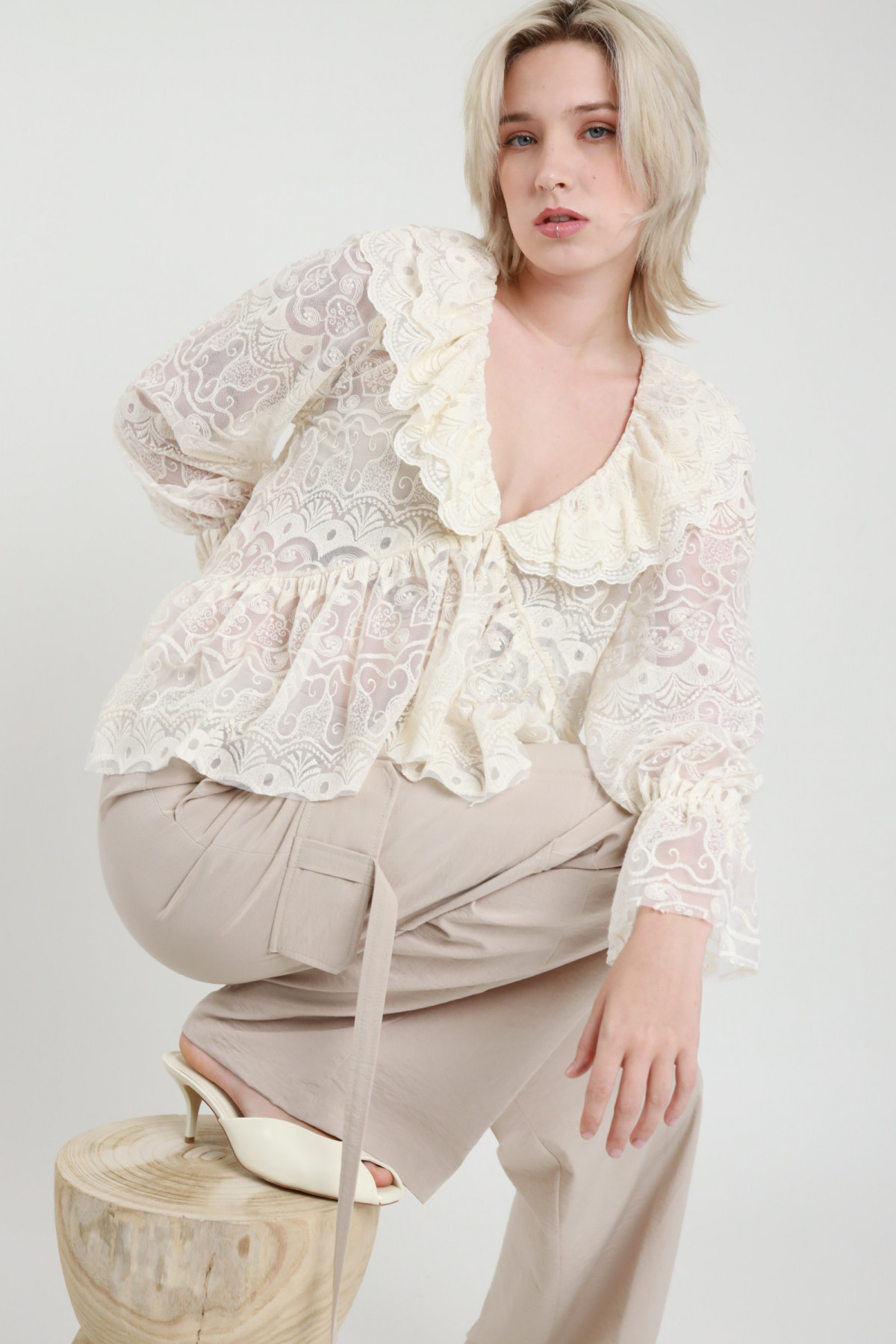 Halbtransparente Crop-Bluse mit Spitze am Saum, Ballonärmel mit Gummizug an den Handgelenken, V-Ausschnitt. 85 % 15 % pl