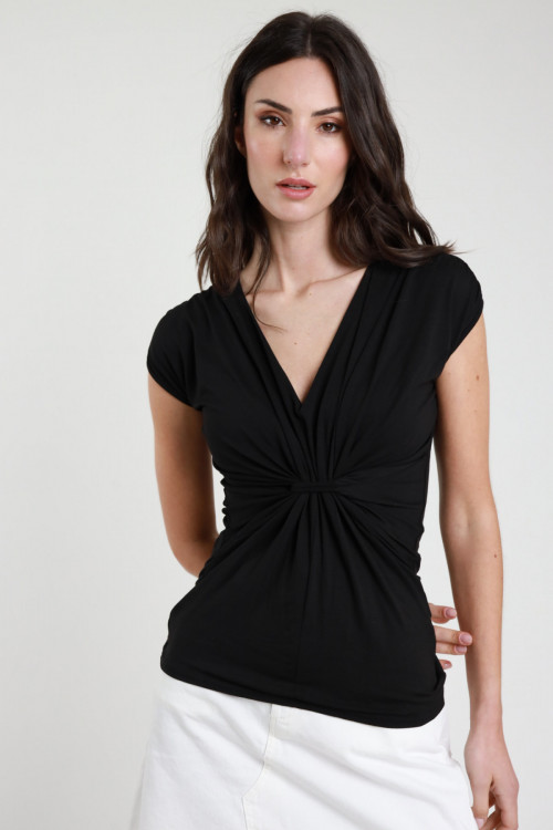 Asymmetrisches T-Shirt aus Stretch-Viskose mit goldenem Accessoire an der Schulter. 94 %vi 6 %ea