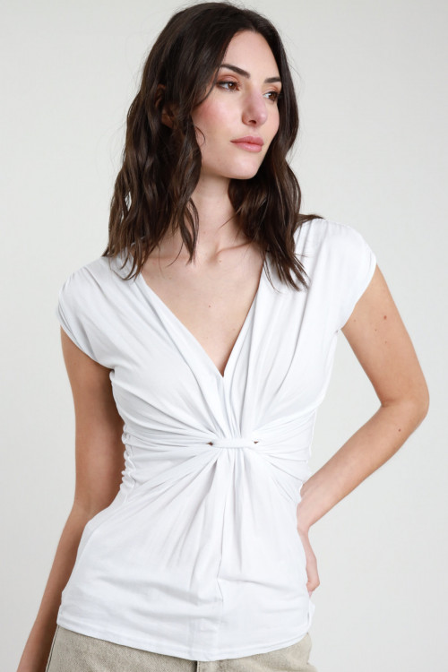 Asymmetrisches T-Shirt aus Stretch-Viskose mit goldenem Accessoire an der Schulter. 94 %vi 6 %ea