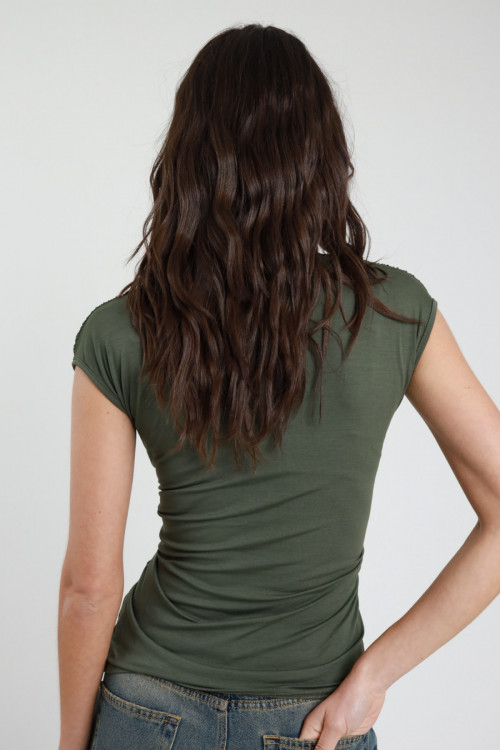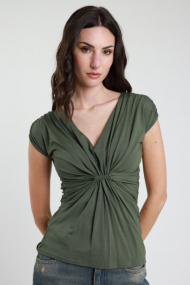 Asymmetrisches T-Shirt aus Stretch-Viskose mit goldenem Accessoire an der Schulter. 94 %vi 6 %ea
