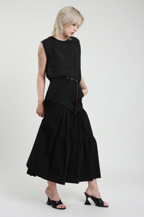 Long Cotton Skirt with Ruffles, 4 Pockets, Elastic Waist and Faux Leather Belt. 100%co