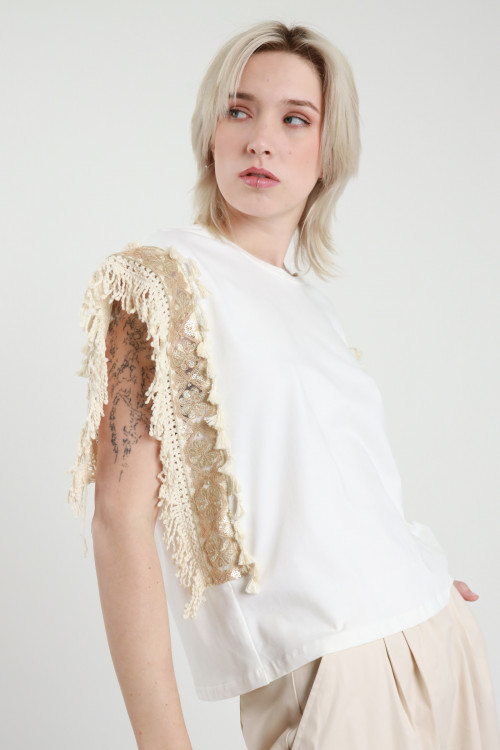 Asymmetrisches T-Shirt aus Stretch-Viskose mit goldenem Accessoire an der Schulter. 94 %vi 6 %ea