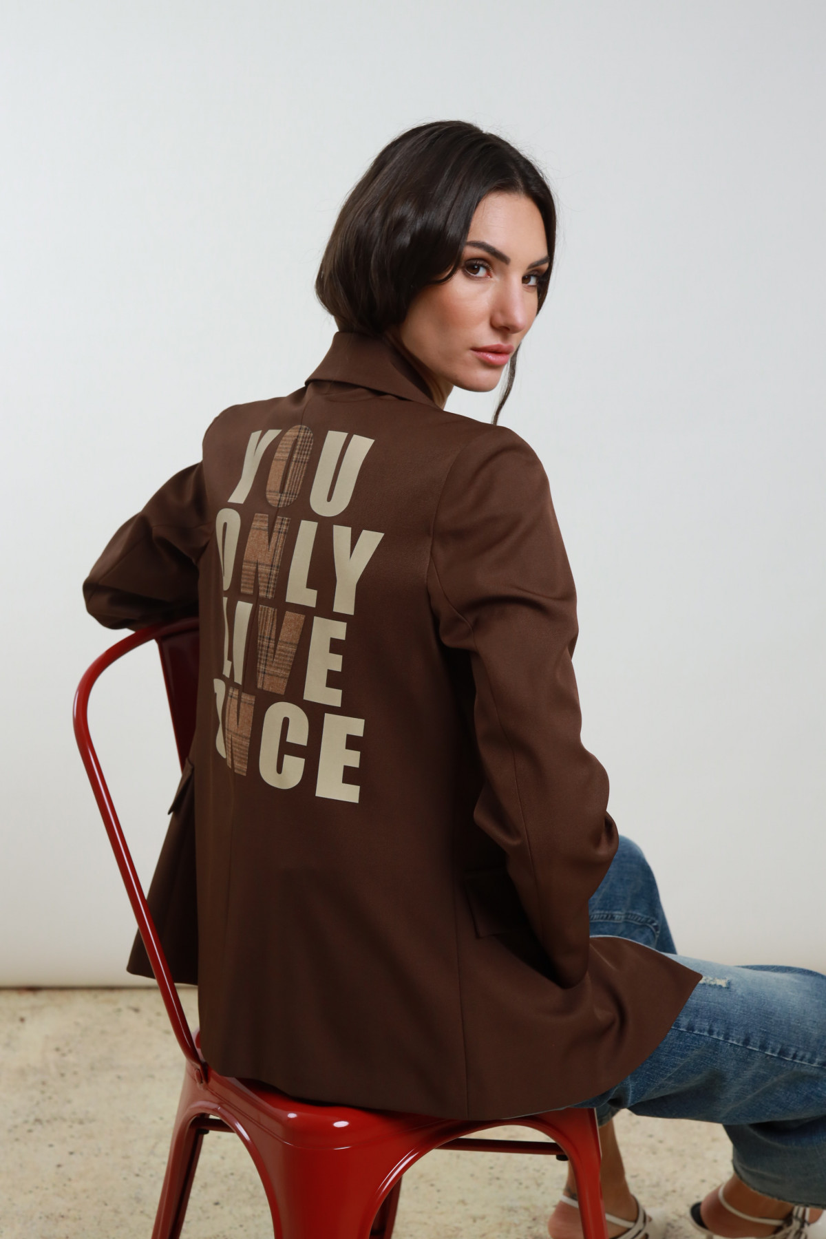 Blazer with writing on the back You Live Once You Once, Classic Rever, closing a button and fillet pockets with skate. 96%PL 4%EA+100%PL