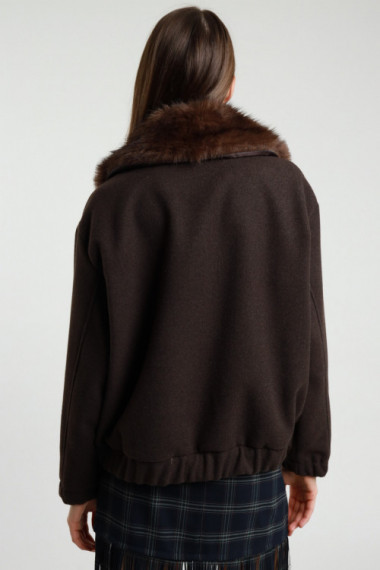 Bomber in Ecopelle con Eco Pelliccia sul Collo, Tasche Laterali ed Elastico sul Fondo.