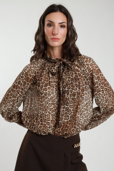 Camicia Semitrasparente in Stampa Animalier Leopardata con Maniche Palloncino.