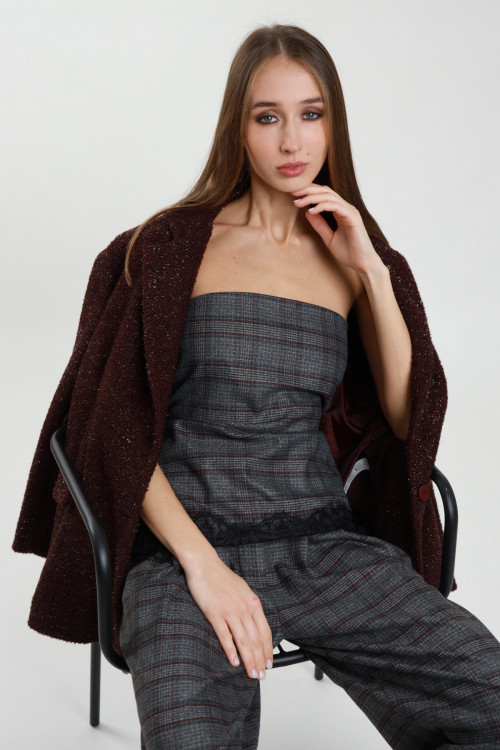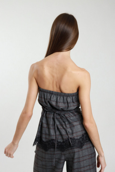 Strapless Check Top with Lace Details and Elastic on the Back. 63%pl 34%vi 3%ea