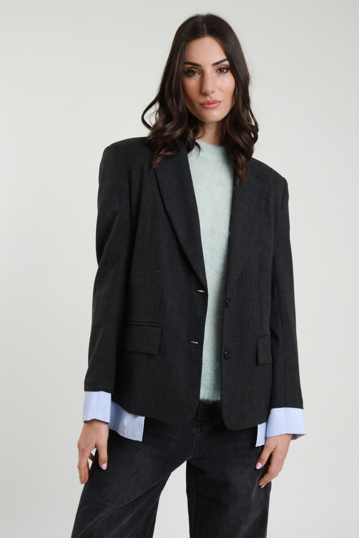 Double-breasted jacket with writing, classic lapels and two front welt pockets. 70%pl 15%wo 15%vi+100%pl