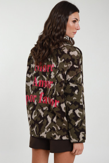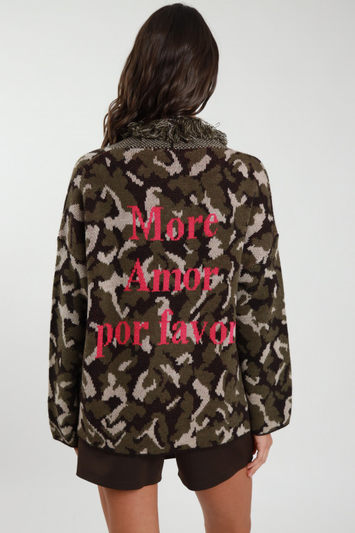 Military Cardigan with Fringes and Colored Writing on the Back. 75%ac 10%vi 10%wo 5%wp