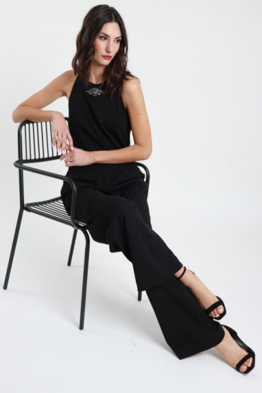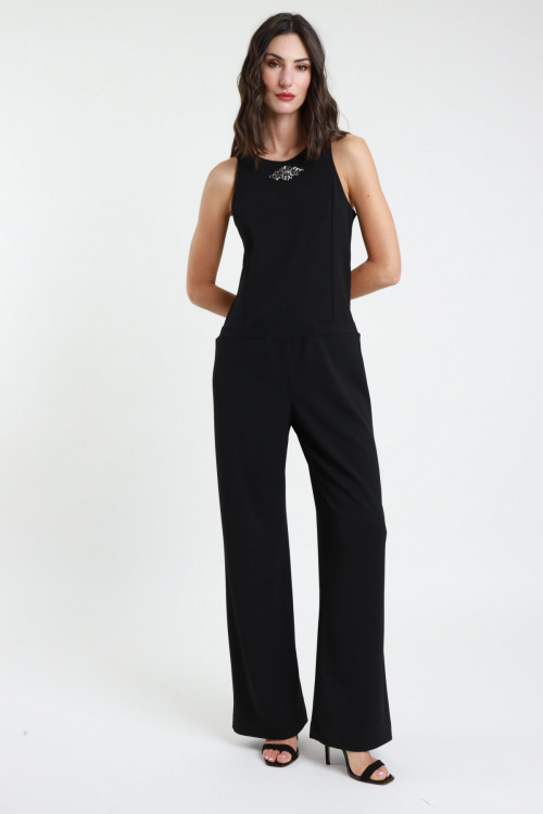 Cordoverall mit tiefem V-Ausschnitt. Breite Caprihose und Gürtel. 50 %rPET 37 %pl 10 %ny 3 %ea