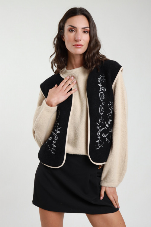Waistcoat with embroidery on the front and contrasting edges. 58%wo 48%pl+96%pl 4%ea