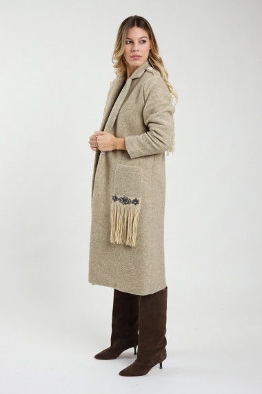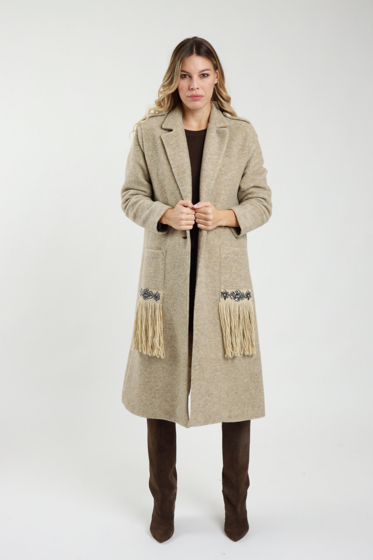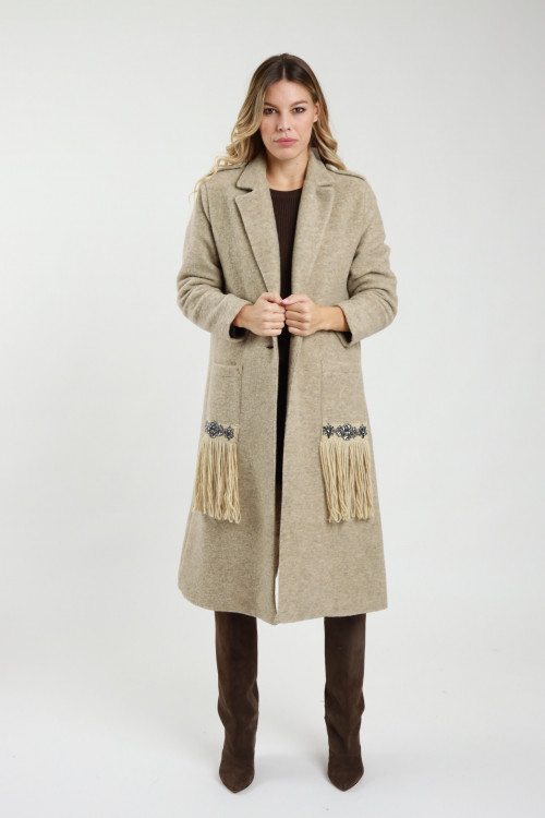 Coat With Fringed Applications On The Pockets And On The Back. 58%wo 48%pl+100%pl