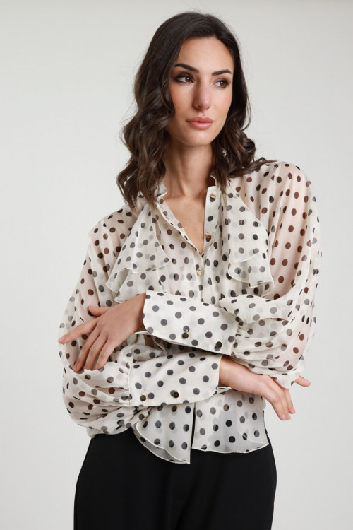 Blusa Semitrasparente con Maniche Ampie, Lunga sul Retro e Dettaglio Bottoni.