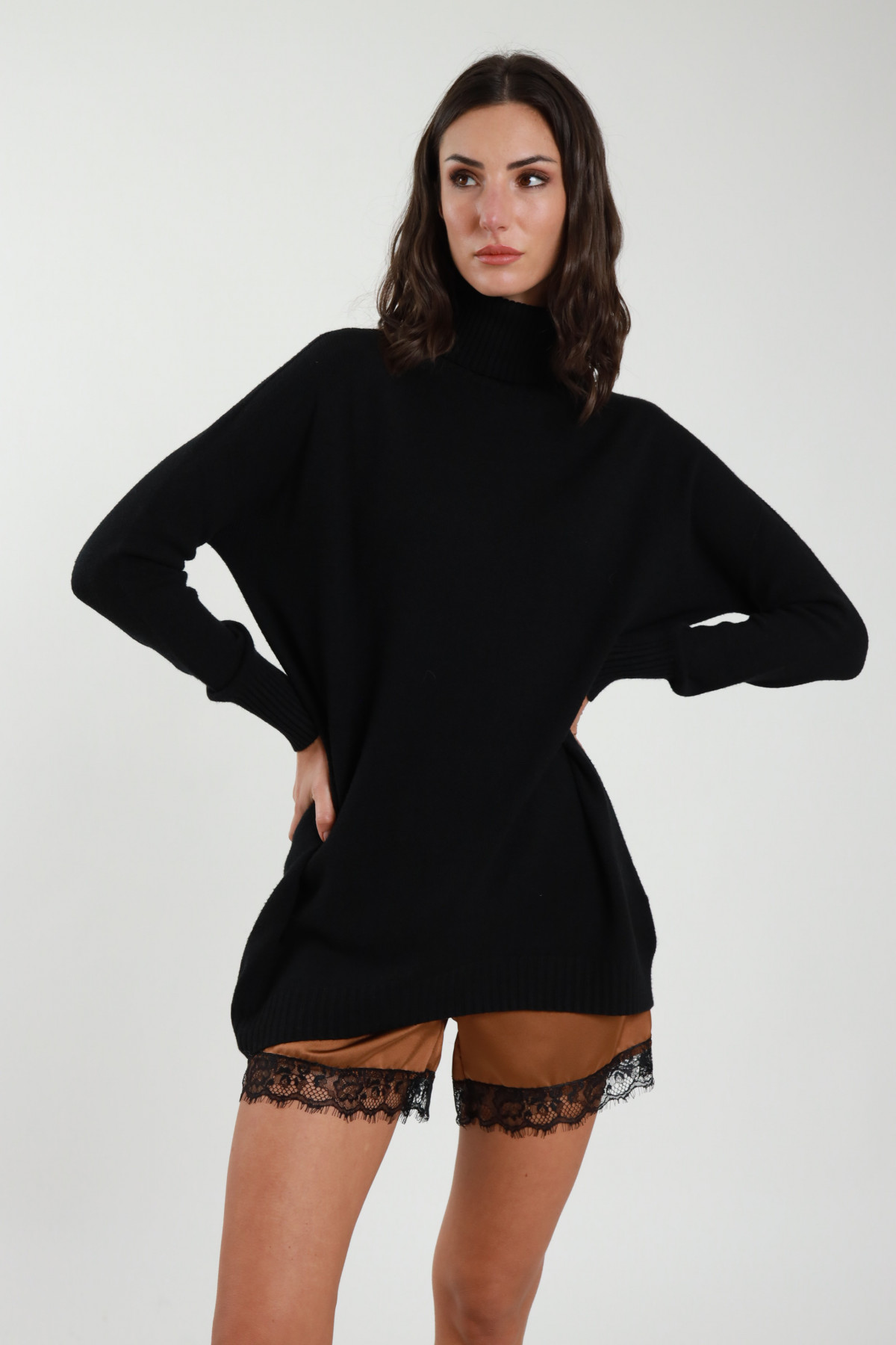 Loose, long, ribbed turtleneck sweater. 50%vi 27%pl 23%pa