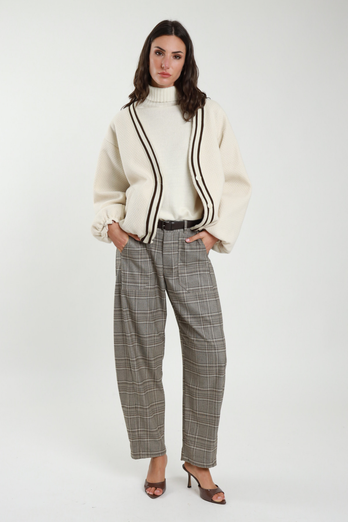 Egg cut check trousers, with elastic waist on the back, belt and patch pockets. 63%pl 34%vi 3%ea