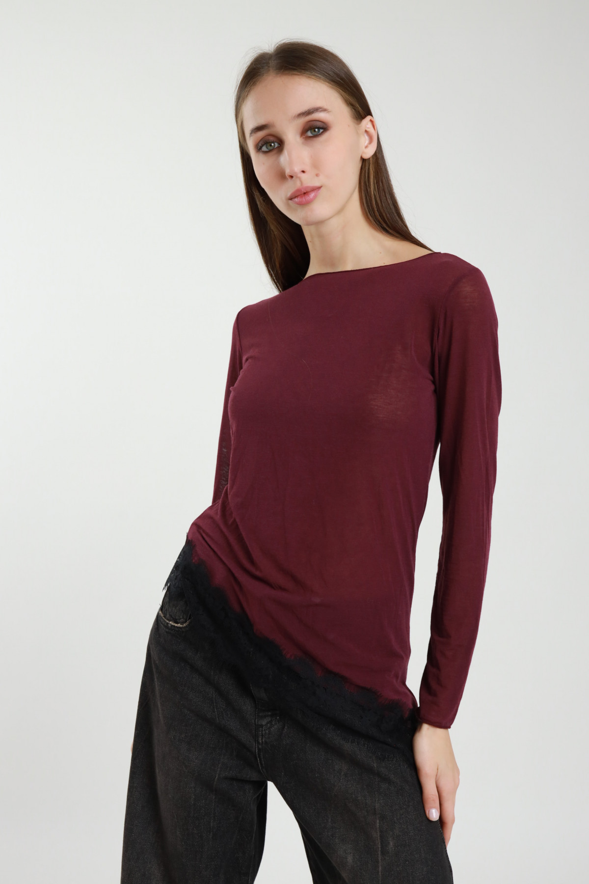 Long-sleeved T-shirt with boat neckline and lace on the bottom. 80%vi 9%pa 6%ea 5%ws