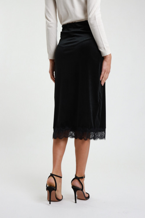 Flared skirt in spotted pattern, satin effect with lace hems and side slit. 100%pl