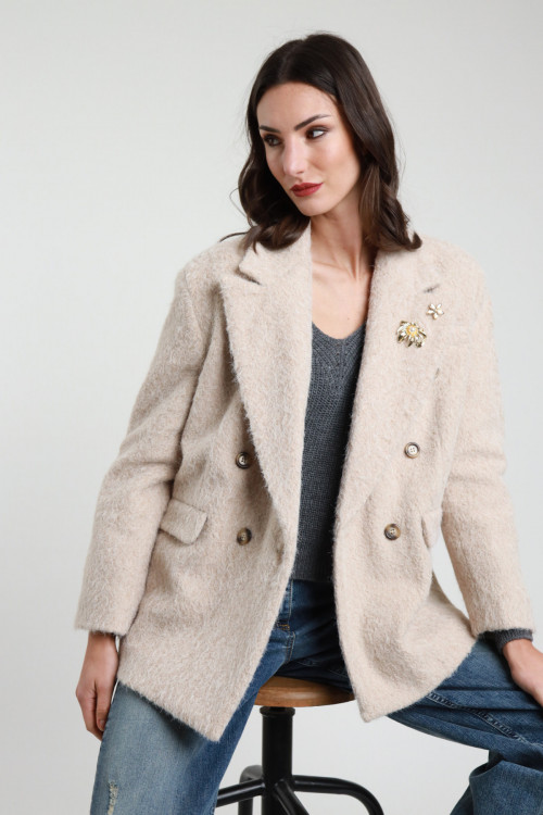 Zweireihiger Kurzmantel, Pfirsichknochenmuster, abnehmbarer Kunstpelzkragen.77%pl 15%wo 3%vi 3%pc 2%pa