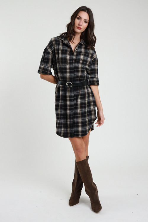 Langes Kleid mit verstellbaren, schmalen Gurten mit Stickerei am Boden und Ausschnitt, Pied de Poule Fantasy. Abnehmbare Culotte im Kleid enthalten. 100%pl