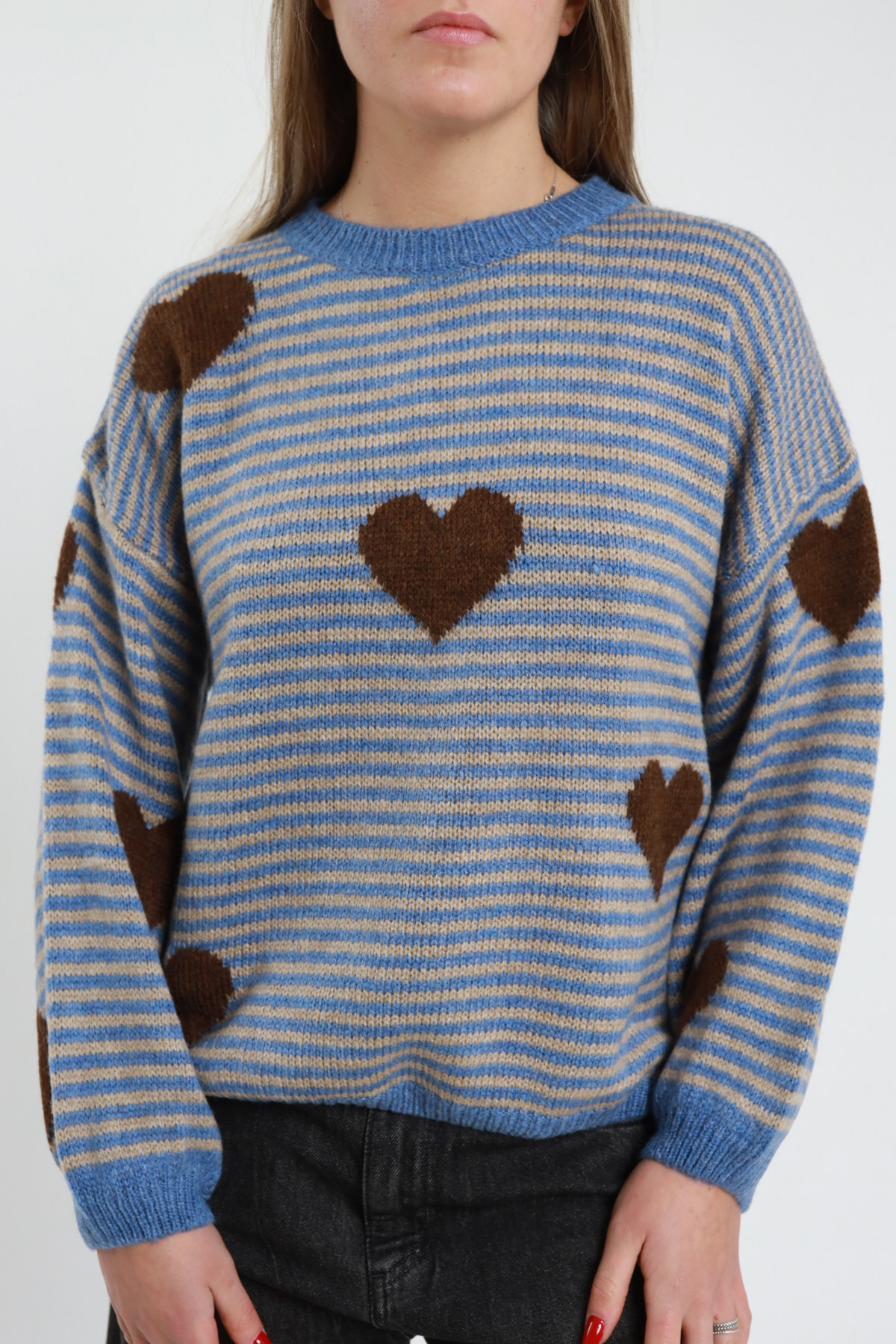 Striped crew-neck sweater with large contrasting hearts. 80%ac 20%pa