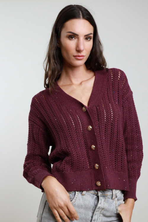 Cardigan Scollo V Traforato con Dettaglio Tessuto Micro Paillettes.
