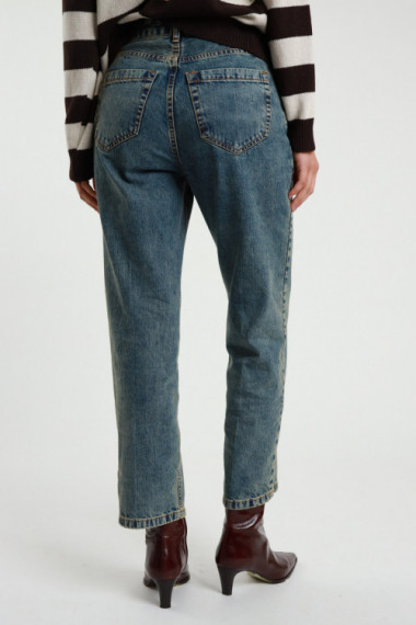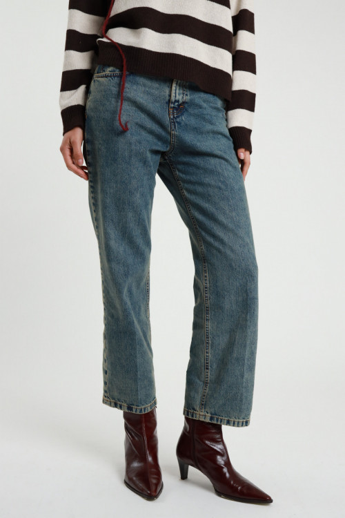 Denim Con Stampa Floccata, Taglio Ad Ovetto Con Risvolto, Tasche A Portafoglio e Cinturina In Vita.