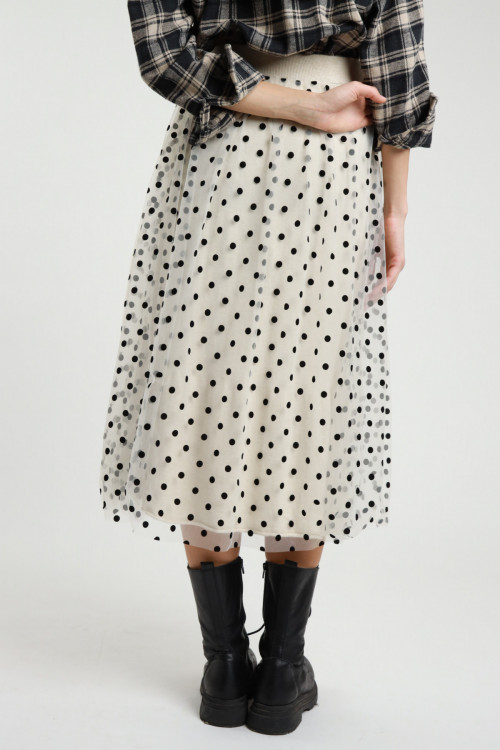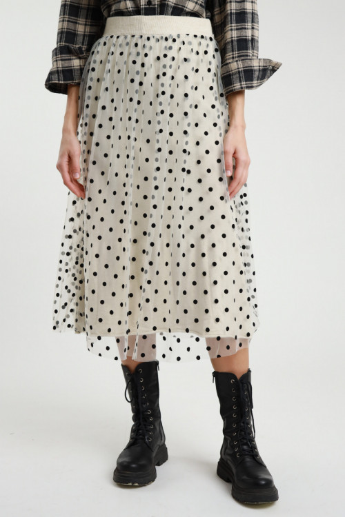 Long dress undernovations with adjustable narrow straps, with embroidery on the bottom and neckline, pied de poule fantasy. Removable culotte included in the dress. 100%PL